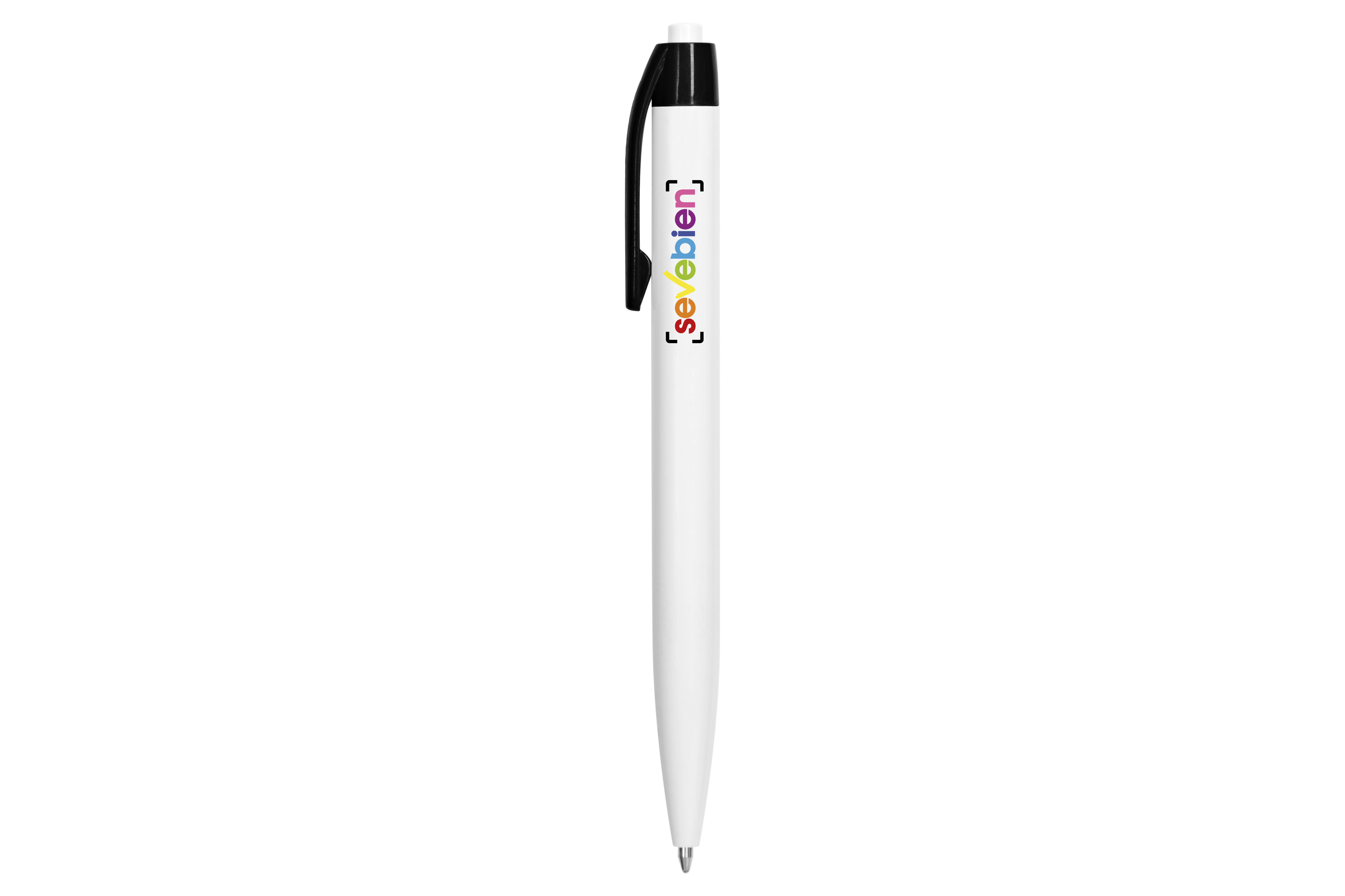 Plástico. Bolígrafo con cuerpo y pulsador de color blanco y clip en color. Tinta negra.