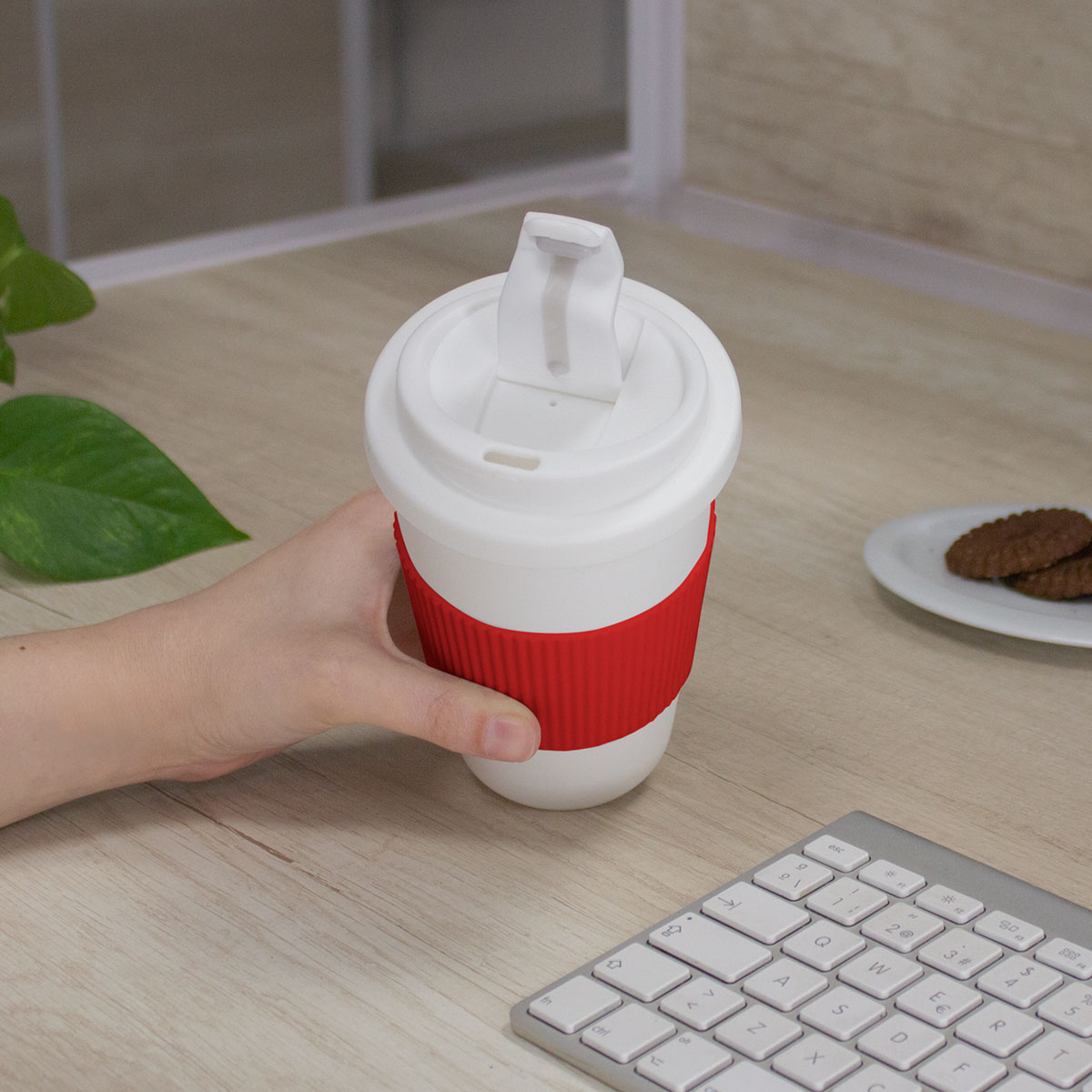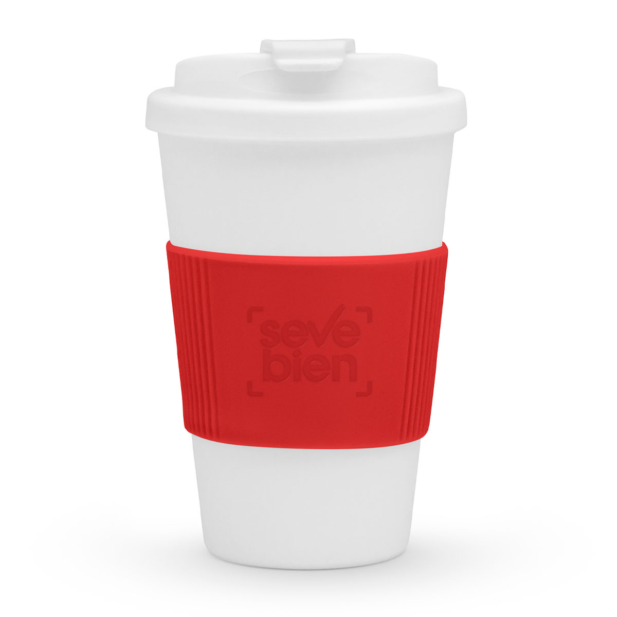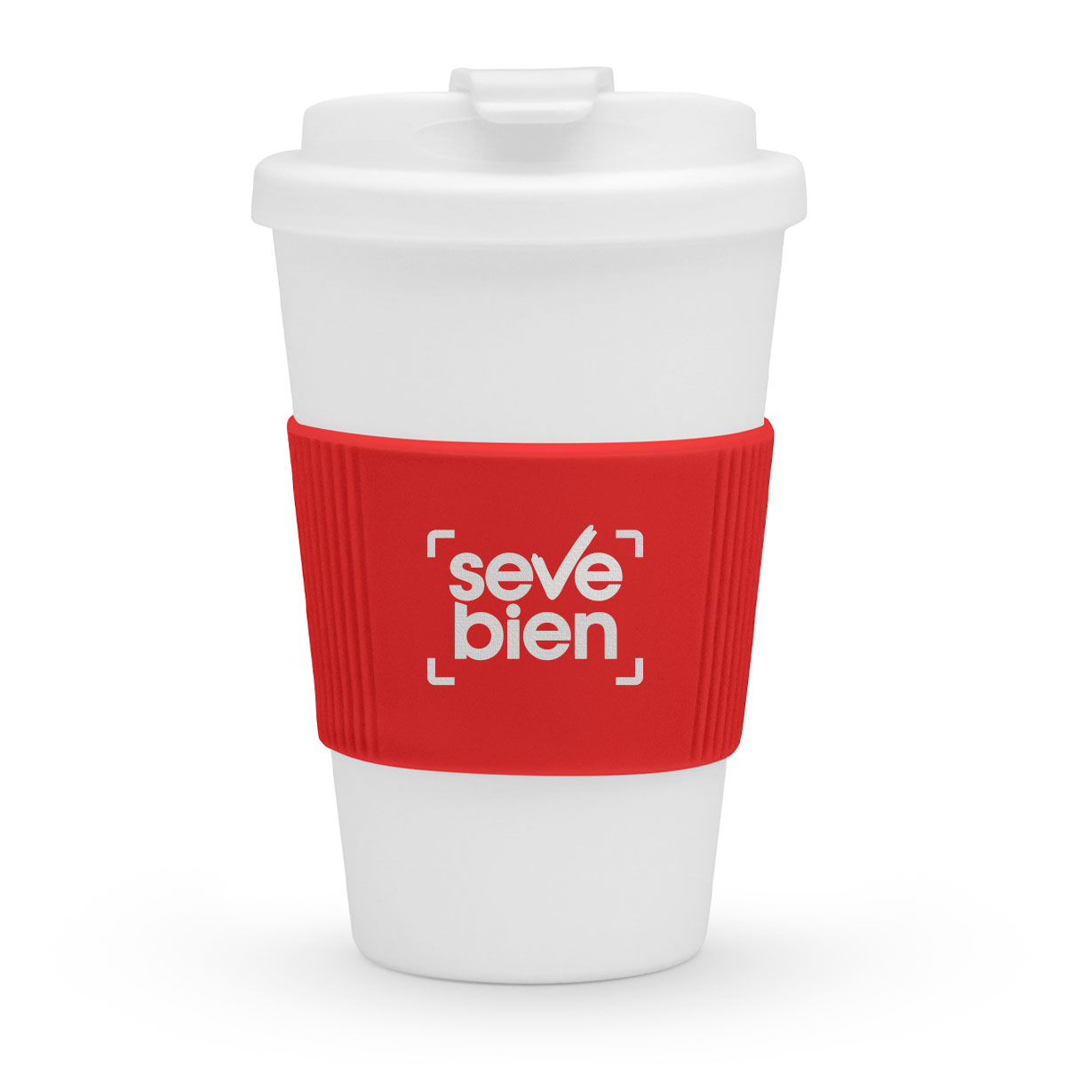 Ø 9.5 x 16 cm. Capacidad 330 ml. Plástico BPA free + manga de TPR. Vaso térmico doble pared con tapa a rosca y seguro antivuelco para que puedas transportarlo a todos lados. La manga siliconada es ideal para un agarre antideslizante. Mantiene las bebidas frías o calientes por más tiempo. Presentación en caja de regalo.