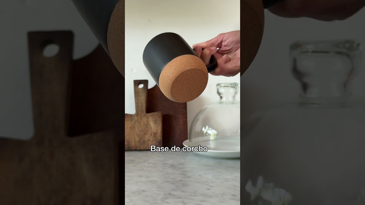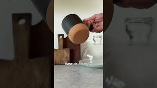 Taza con tapa. Tapa plástica a presión color negro con anillo de silicona. Base de corcho. Pintura con acabado mate. Producto apto para microondas siempre retirando la base de corcho.